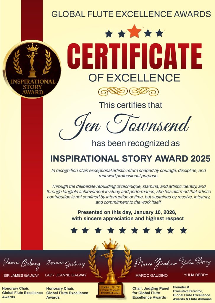 In recognizing Jen Townsend with the Inspirational Story Award 2025, the Global Flute Excellence Awards affirm an artistic journey defined by seriousness, renewal, and action — offering inspiration through tangible achievement and reaffirming the enduring possibility of artistic return at the highest level.