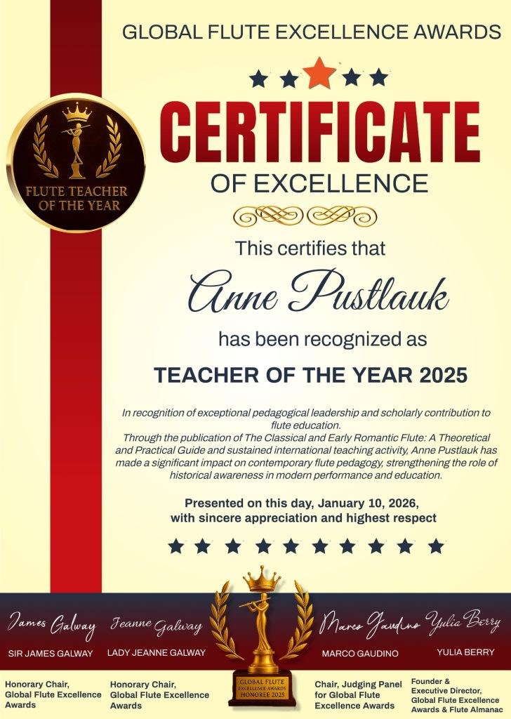 In recognizing Anne Pustlauk as Teacher of the Year 2025, the Global Flute Excellence Awards acknowledge a year marked by significant scholarly achievement and a sustained commitment to teaching that strengthens the intellectual and artistic foundations of the flute world.